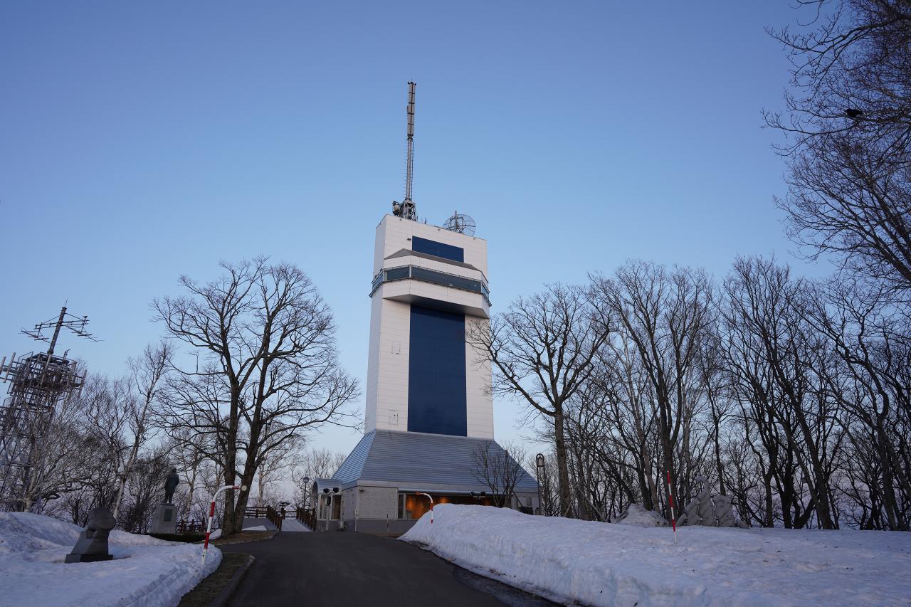 紋別山という山の頂上にある施設で、電波塔として利用されつつ、展望台としても営業しています。なんだか一昔前の携帯電話のような形にも見える。