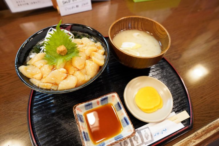 「海鮮食堂よってけまるとみ」で漬けホタテ丼を堪能