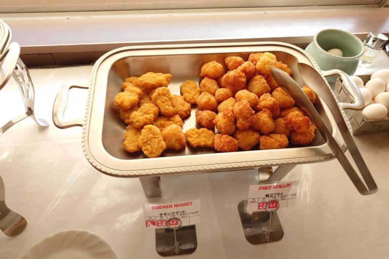 そしてチキンナゲットと帆立フライがありました。以前はミートボールや鶏の唐揚げだったので、定期的に変更されているようです。帆立フライの時は当たりなのかもしれない。