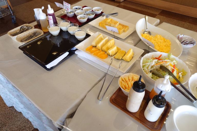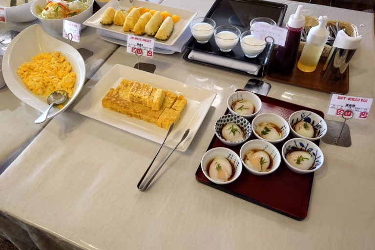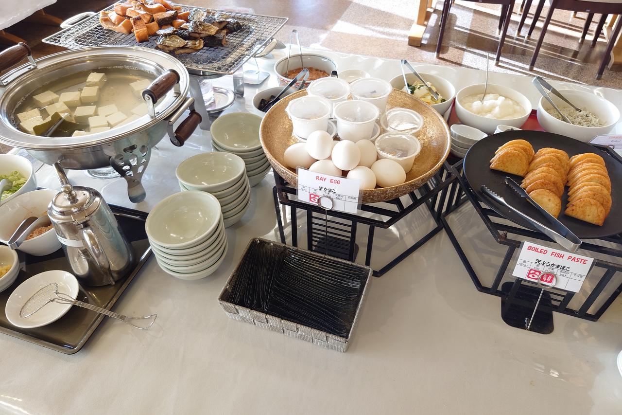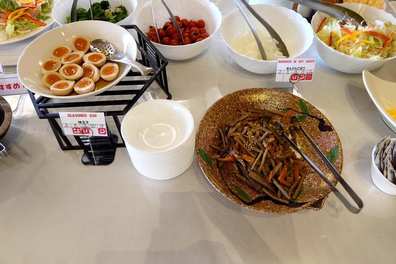まずは卵コーナー。ここの朝食ってやけに卵メニューが豊富で、まずは温泉たまごに厚焼玉子、さらにスクランブルエッグが並びます。