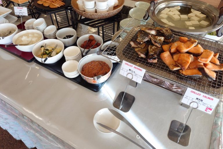 反対側に回って、焼き鮭と焼にしん。サバじゃなくて北海道らしい魚が提供されているのに好感を受けます。その横には塩辛やしらすなど、ご飯のお供になりそうなものが並んでいます。