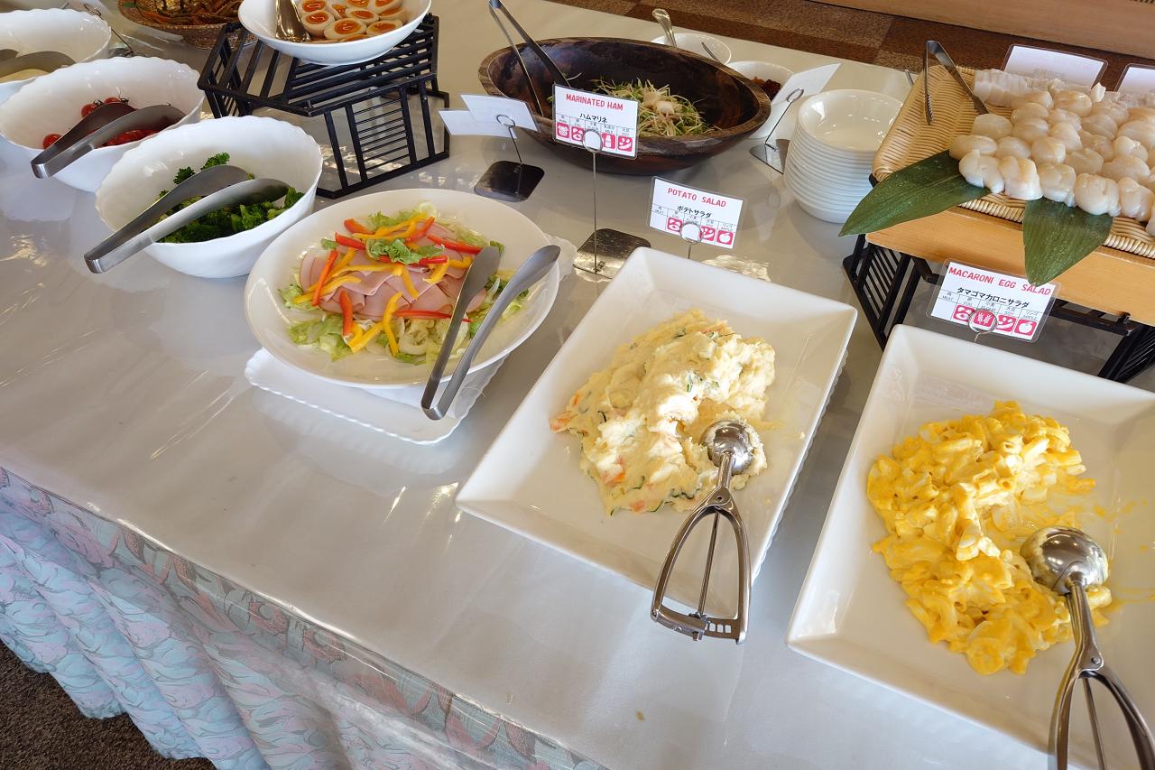 マカロニにポテトサラダ、ハムのマリネの他、ブロッコリーやトマトなどの生野菜があります。