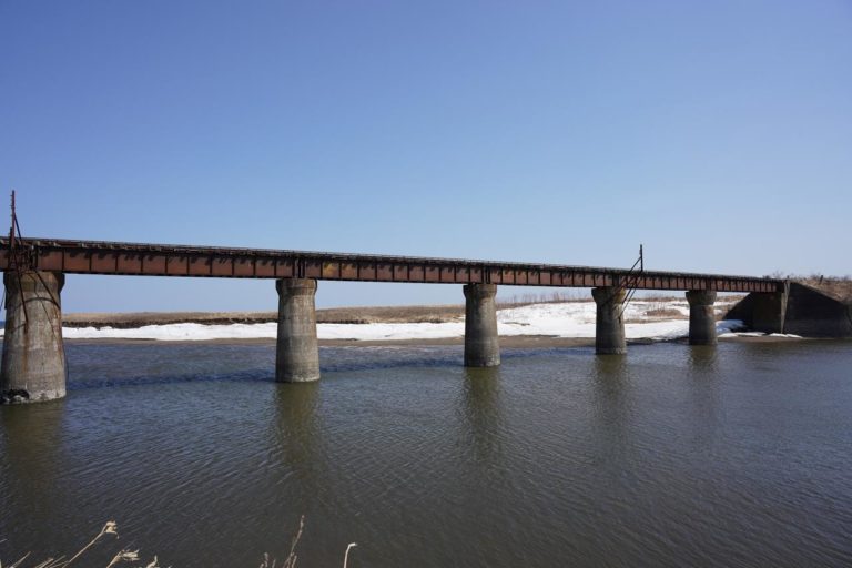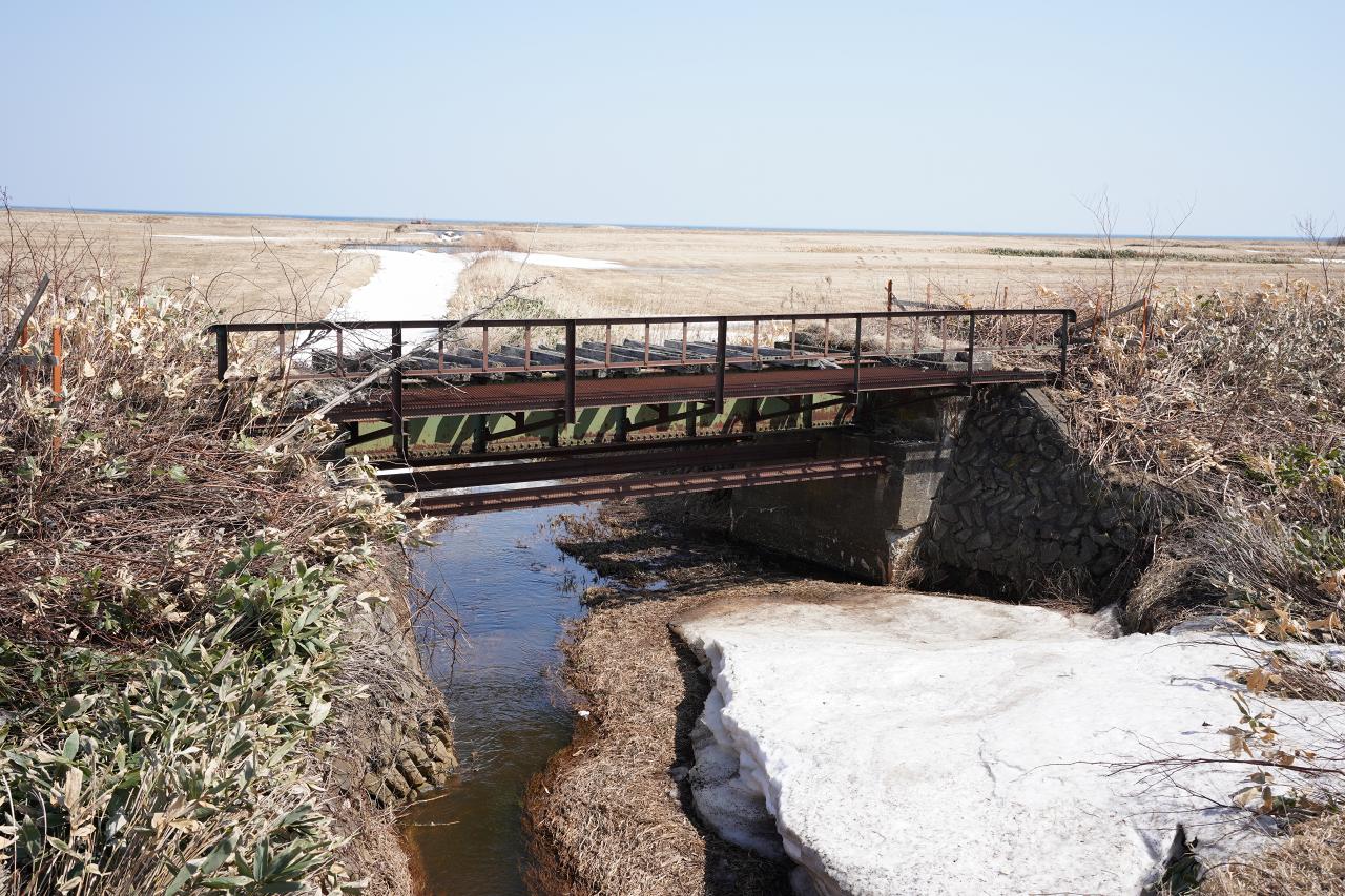 興部南線は次が終点の興部駅。ここまで遺構らしき遺構も見当たらなかったんですが、沢木駅と興部駅の間にある「御西川橋梁」という橋だけは、しっかりと路線の遺構を残しています。地図で見ると道から外れてて行けるの?と思うけど、現地は原っぱが広がっているだけなので簡単に行けます。