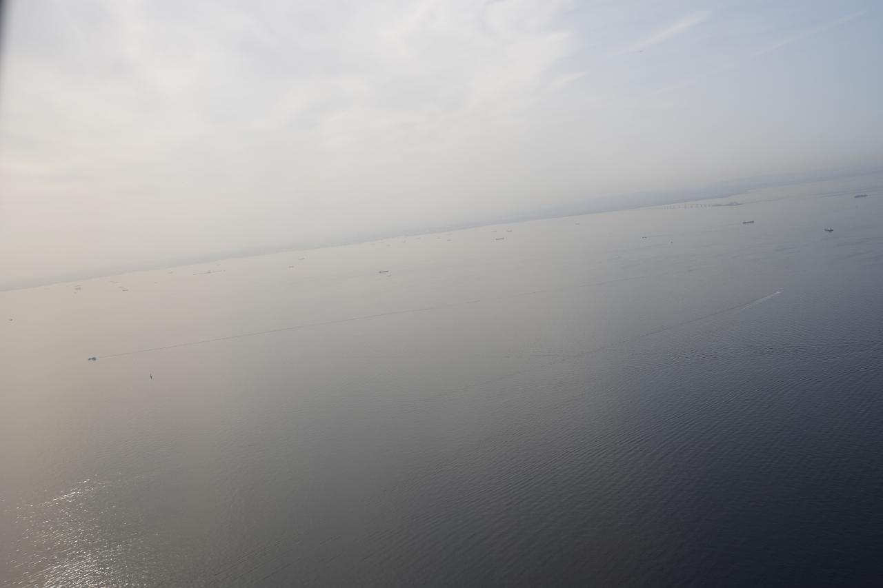 東京湾を見ながら、羽田空港から無事に離陸。ちょっとモヤが掛かっていて遠くまでは良く見えないけど、遠くに見えるのは千葉県でしょうか。