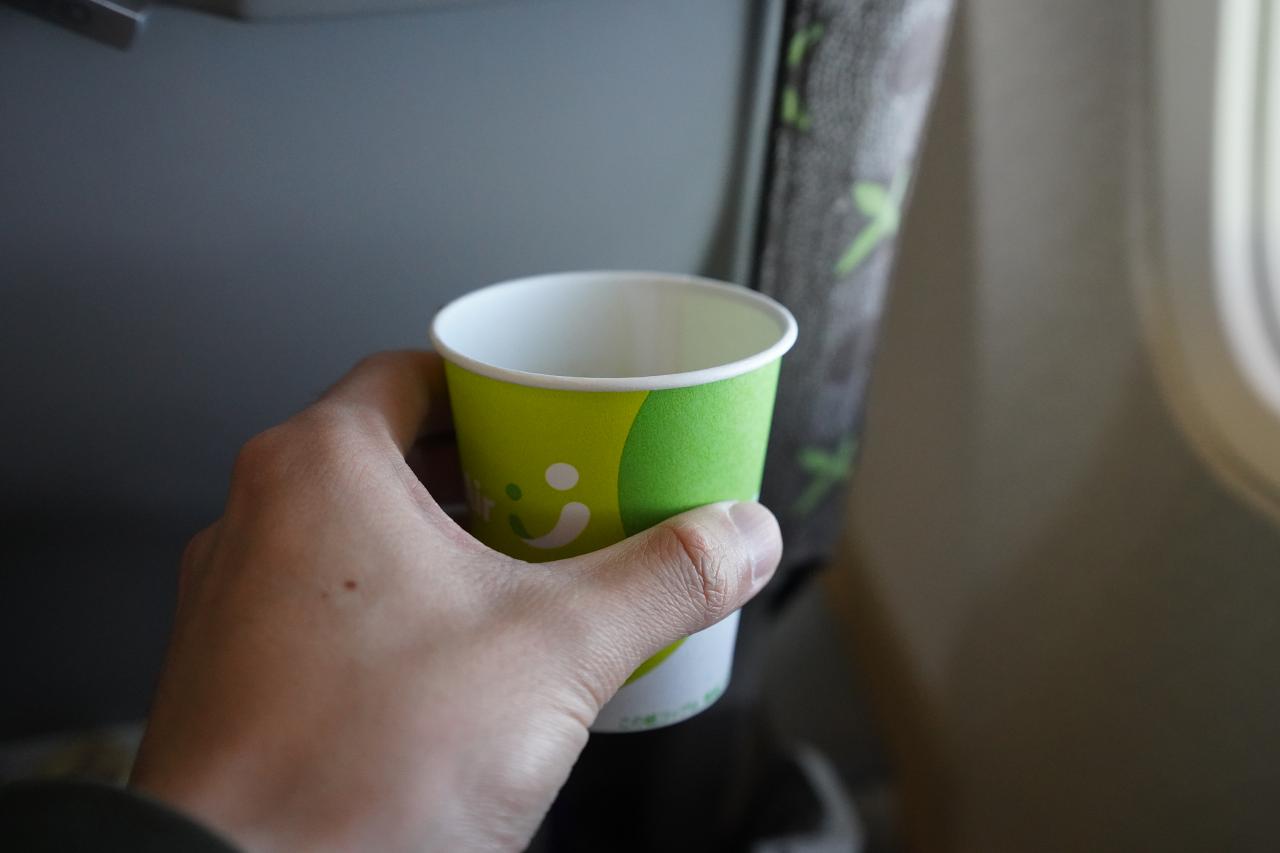 ラウンジで飲み物を飲めなかったので、機内でドリンクをごくごく。コーヒーとアップルジュースをもらいました。