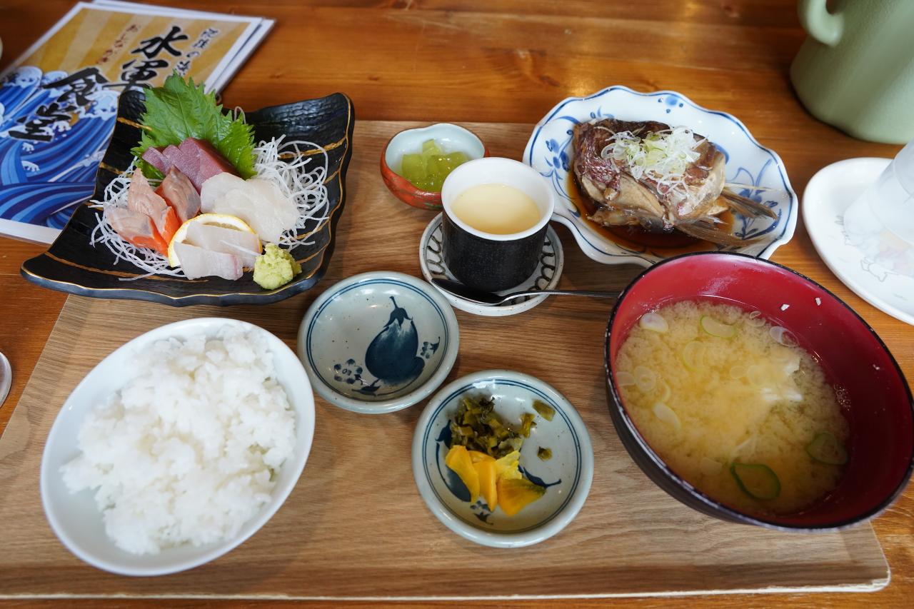 定食内容は刺身4点盛り、魚の煮付け、茶わん蒸しとあら汁の他、デザートにゼリーが付いています。ご飯はおかわり自由なので、お腹いっぱい食べられそうです。