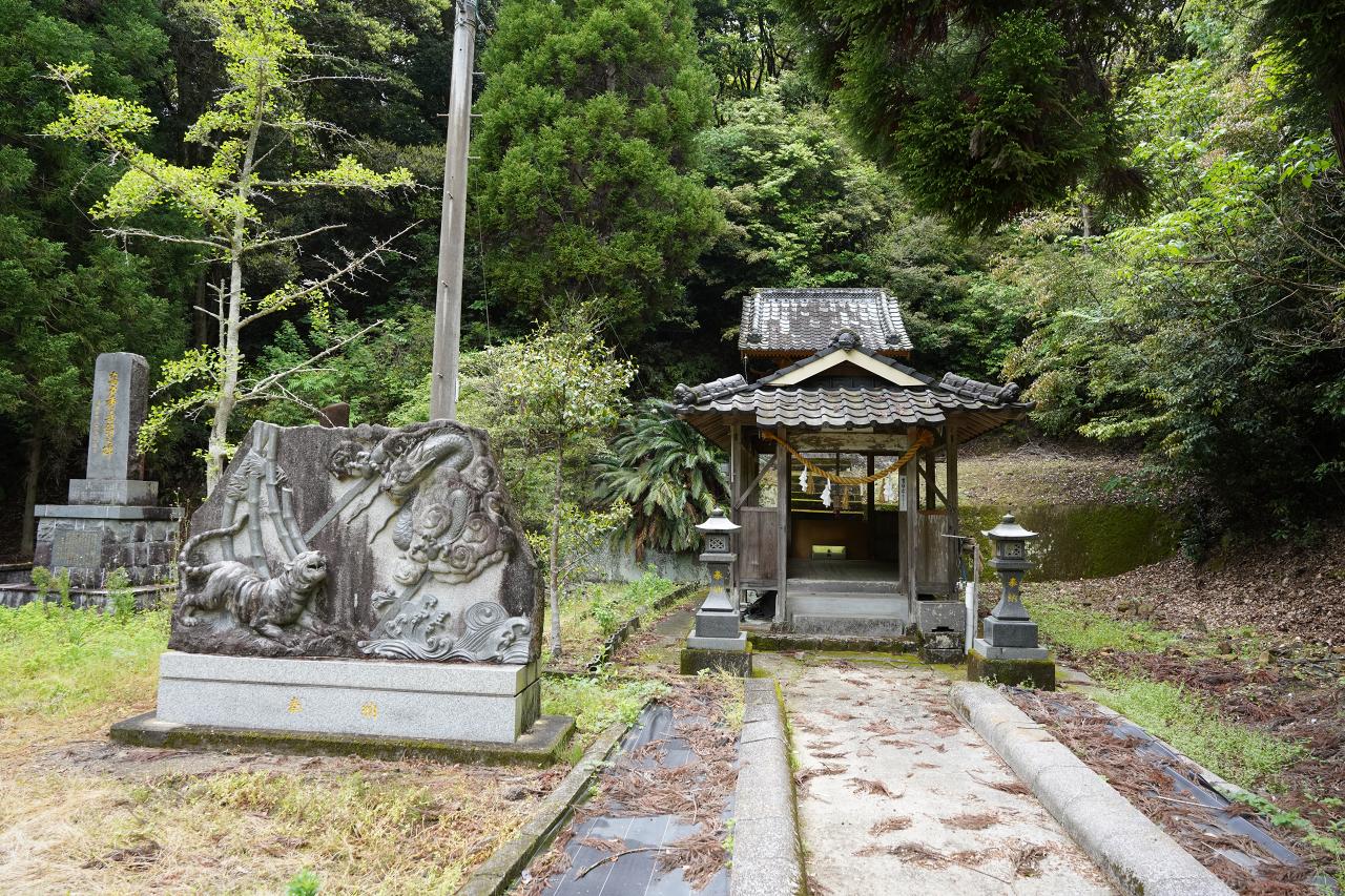 鳥居を抜けてしばらく参道を進むと、虎と龍と思われる石碑。なにやら戦っているようにも見えます。