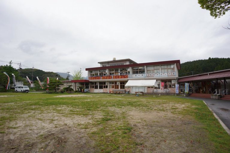 道中に「かかし祭り」という看板があり、会場となっている「道の駅 宮地岳かかしの里」に寄ってみました。ここはもともと小学校だったのが廃校となり、跡地が道の駅として再利用されているようです。