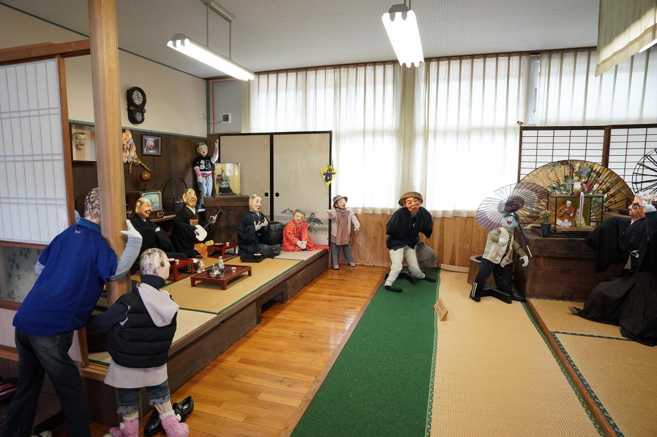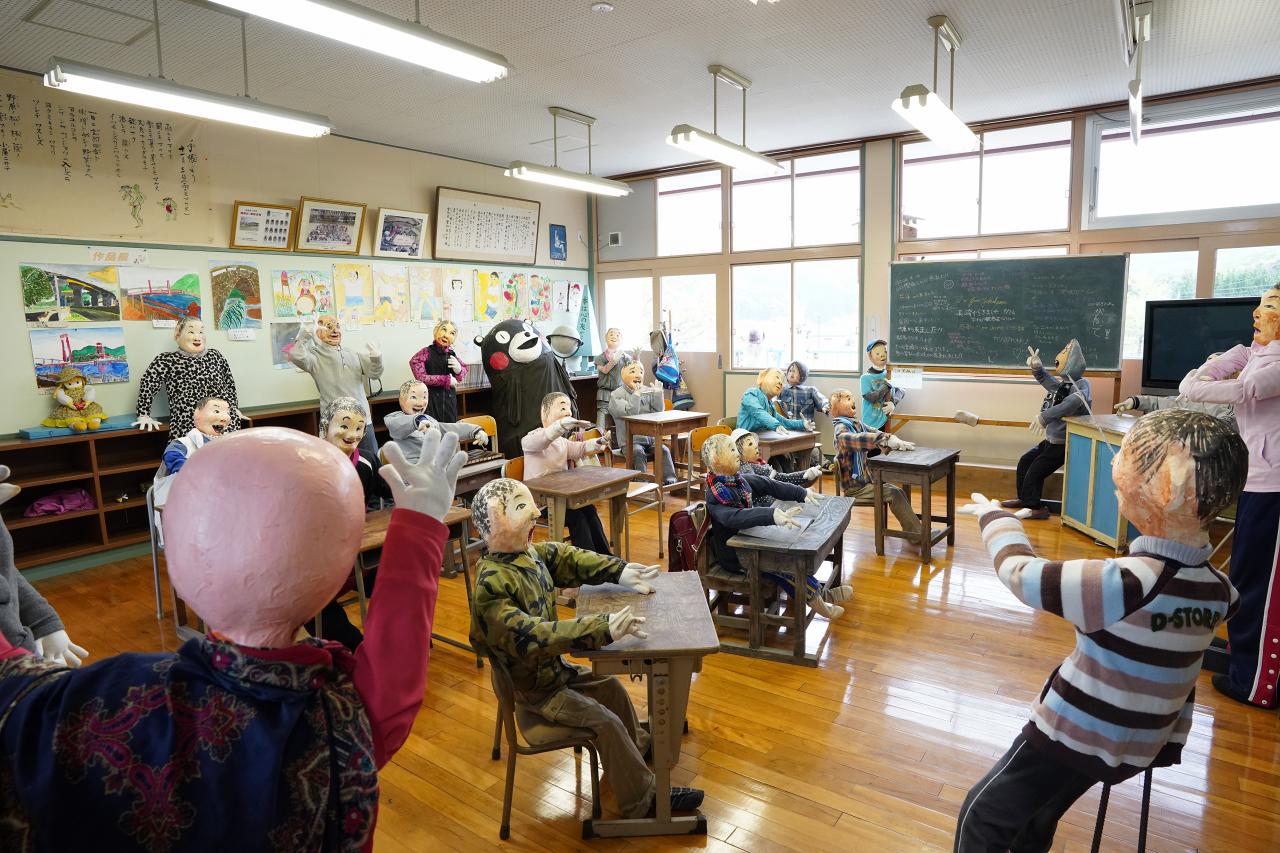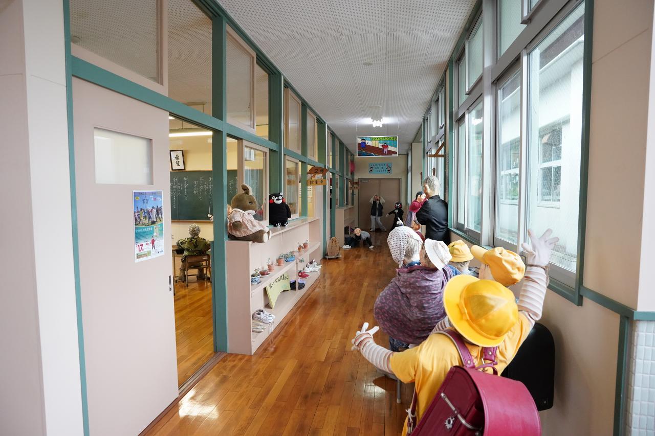 2階エリアにはかかしが大量展示。既に廃校になってしまった学校ですが、まるで児童がたくさんいるようにも見えます。