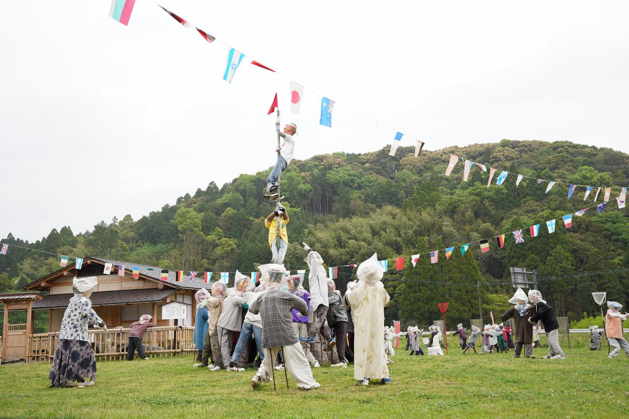 広場では組体操や玉入れなど、運動会の種目を模したかかしがたくさん。これだけの規模感だと迫力も満点だけど、知らずに夜に通ったらビビりそう。