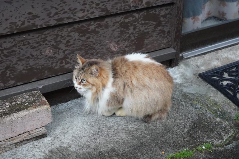 近くに雨宿りしているネコちゃんを発見。ちょこんと座っててかわいい。