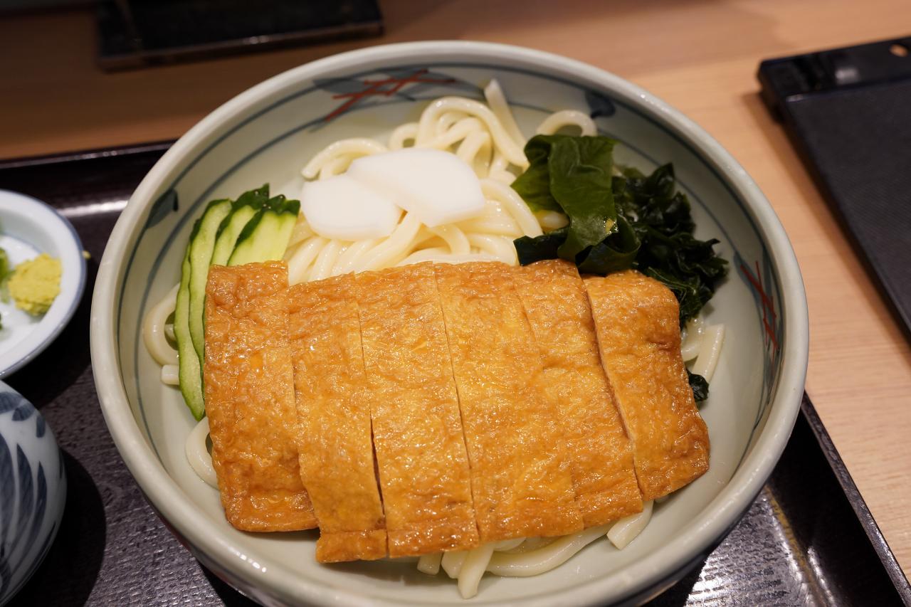注文したのは「冷やしきつねうどん」で1,089円。うどんが隠れるほどの大きな揚げが乗っているのが特徴のうどんです。うどん自体は少し固めでツルツル食べられる美味しい麺。残念だったのはわさびのパンチがあんまり無かったことかな。ごちそうさまです。