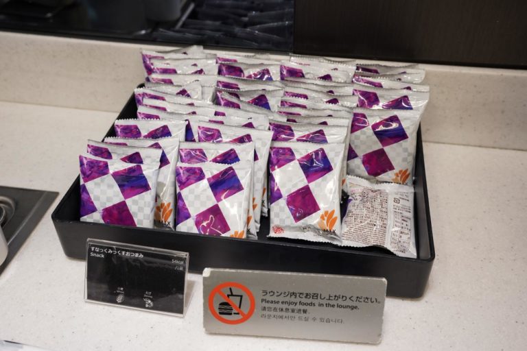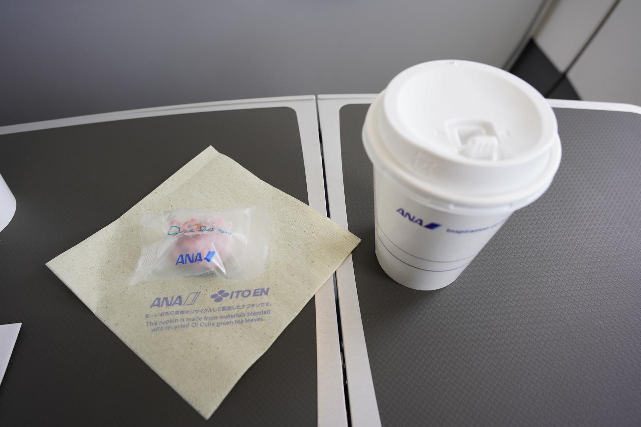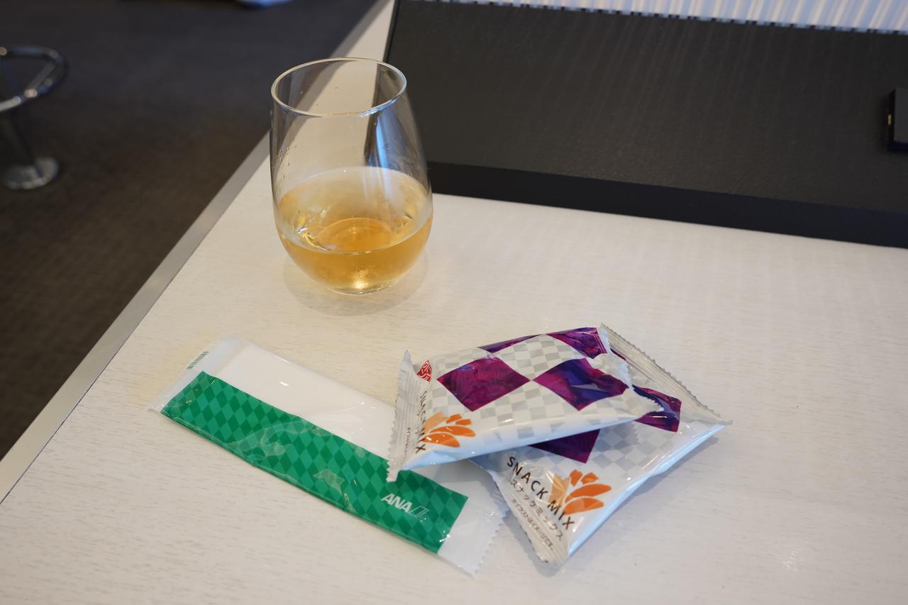 ドリンクはジンジャーエール。グラスが高級感あって、ジュースなのにオシャレなお酒を飲んでいるような感覚になります。そしておつまみにあられを持ってきました。さっき食事を食べたし、機内でも食事が出てくるのであんまり食べ過ぎないようにしないと。