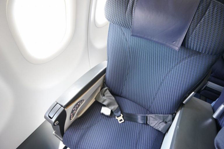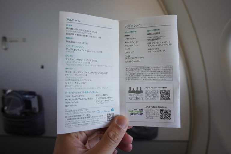 初めて搭乗するANAのプレミアムクラス。通常の座席よりもゆったりとした座席で、横幅も余裕があります。リクライニングもボタン式で、背もたれだけではなく足も上げてフラットのような形にすることも可能。