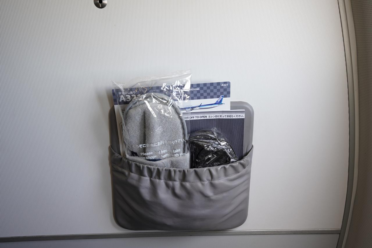正面のポケットには搭乗中に使えるスリッパや、プレミアムクラス専用のヘッドホンも準備されています。時々このヘッドホンが転売されていることがあるけど、それって窃盗では……。