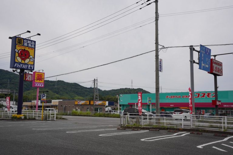 ドラッグストア「モリ」と「コスモス」が向かい合う光景