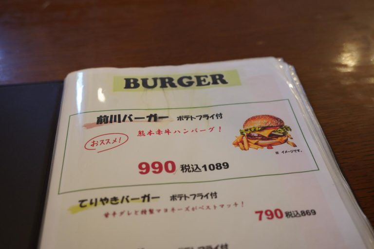 あらかじめメニューを見て、頼むメニューは決まっていました。それがあか牛を使ったハンバーグをサンドした前川バーガー。お値段は1,089円で、優待券の消化にもちょうど良い金額です。