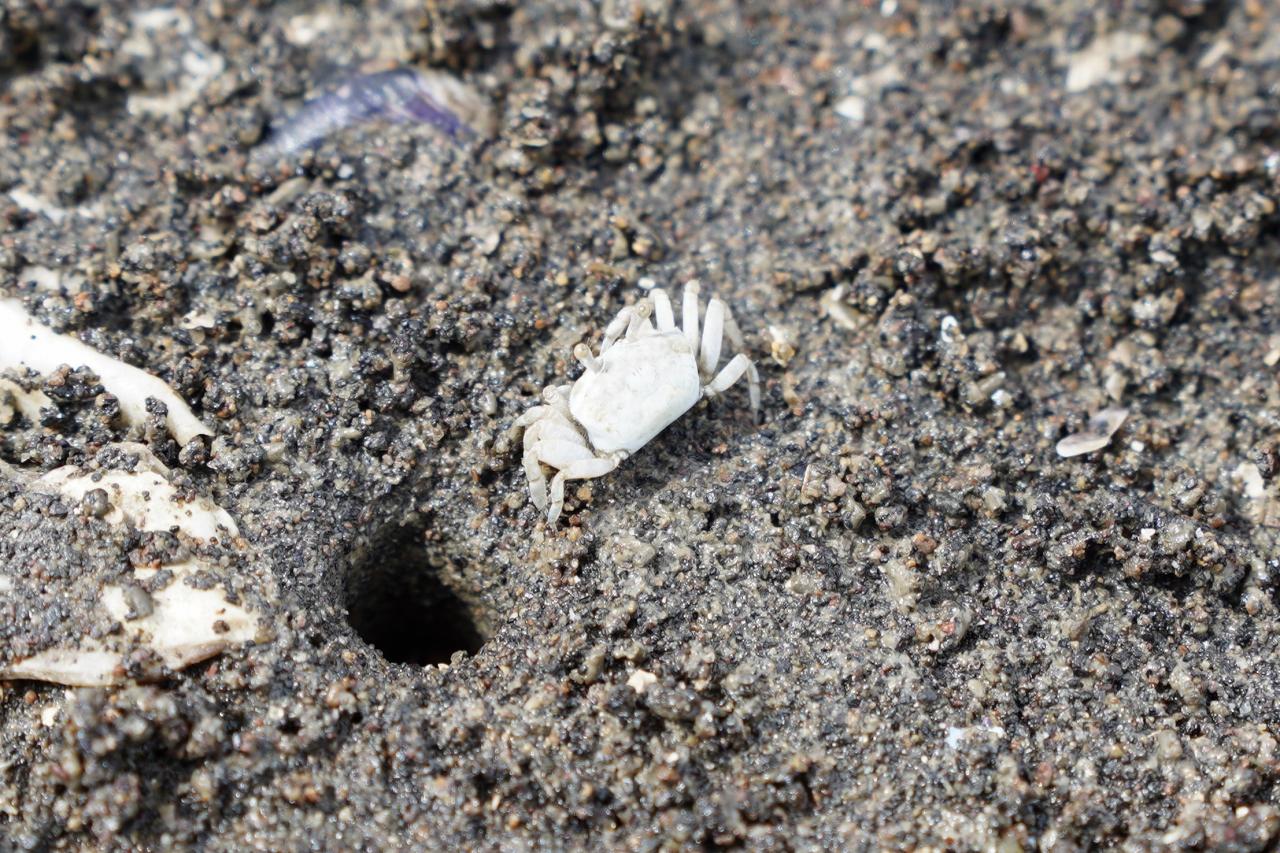 砂地に小さく動く生き物を発見。しゃがんで見てみると小さなカニでした。かわいい。
