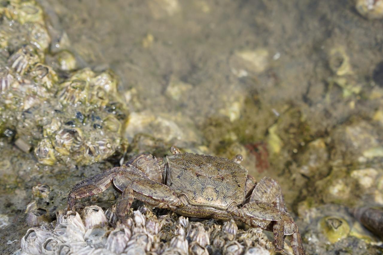 小さいカニは砂に潜って隠れていたけど、ある程度大きくなったら岩陰に隠れて生活しているようです。でもこれって何カニなんだろう。