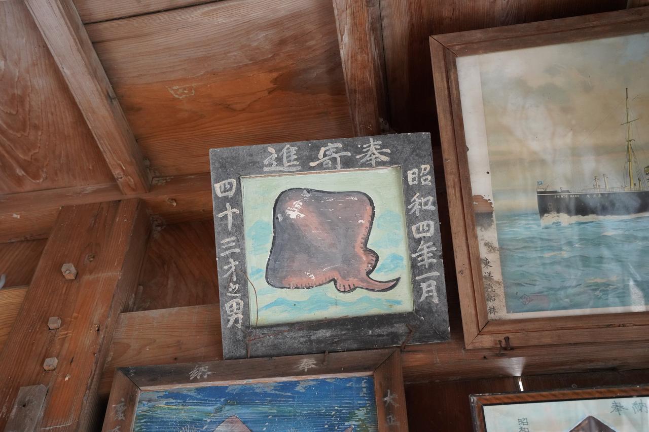 また、壁には多くの人が奉納した「エイ」の絵が飾られています。この絵は昭和4年に奉納されたものらしく、95年間も飾られていることに。なんだか可愛らしいデザインです。