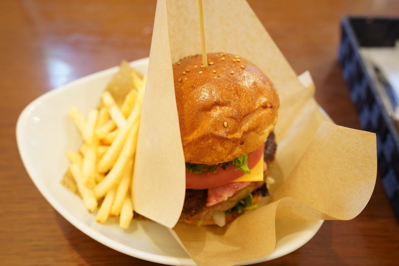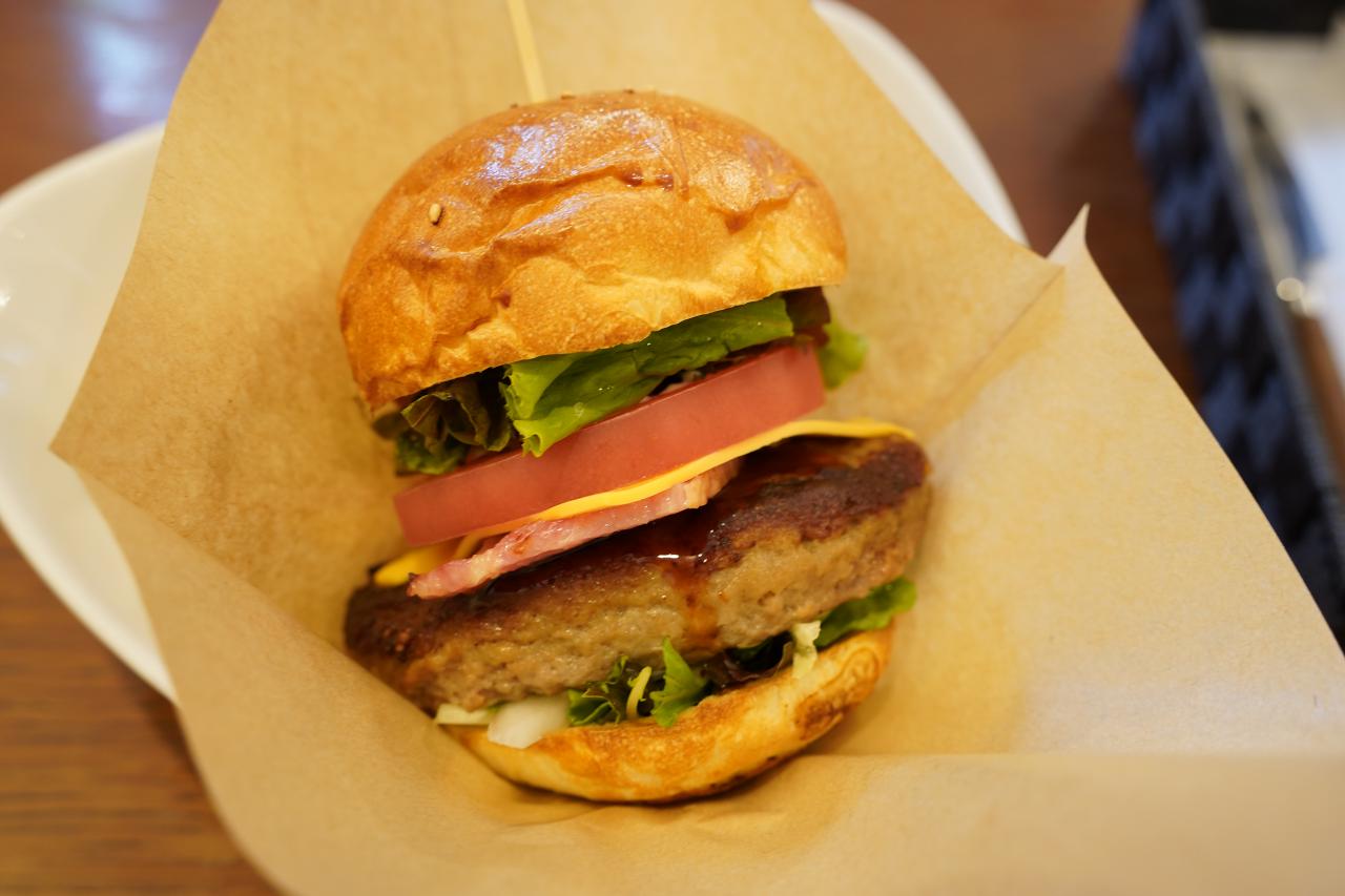 パンズからはみ出るほどの大きさのハンバーグが挟まり、ベーコンや厚切りトマトなども合わさってかなりのボリューム。これ一つ食べればお腹いっぱいです。