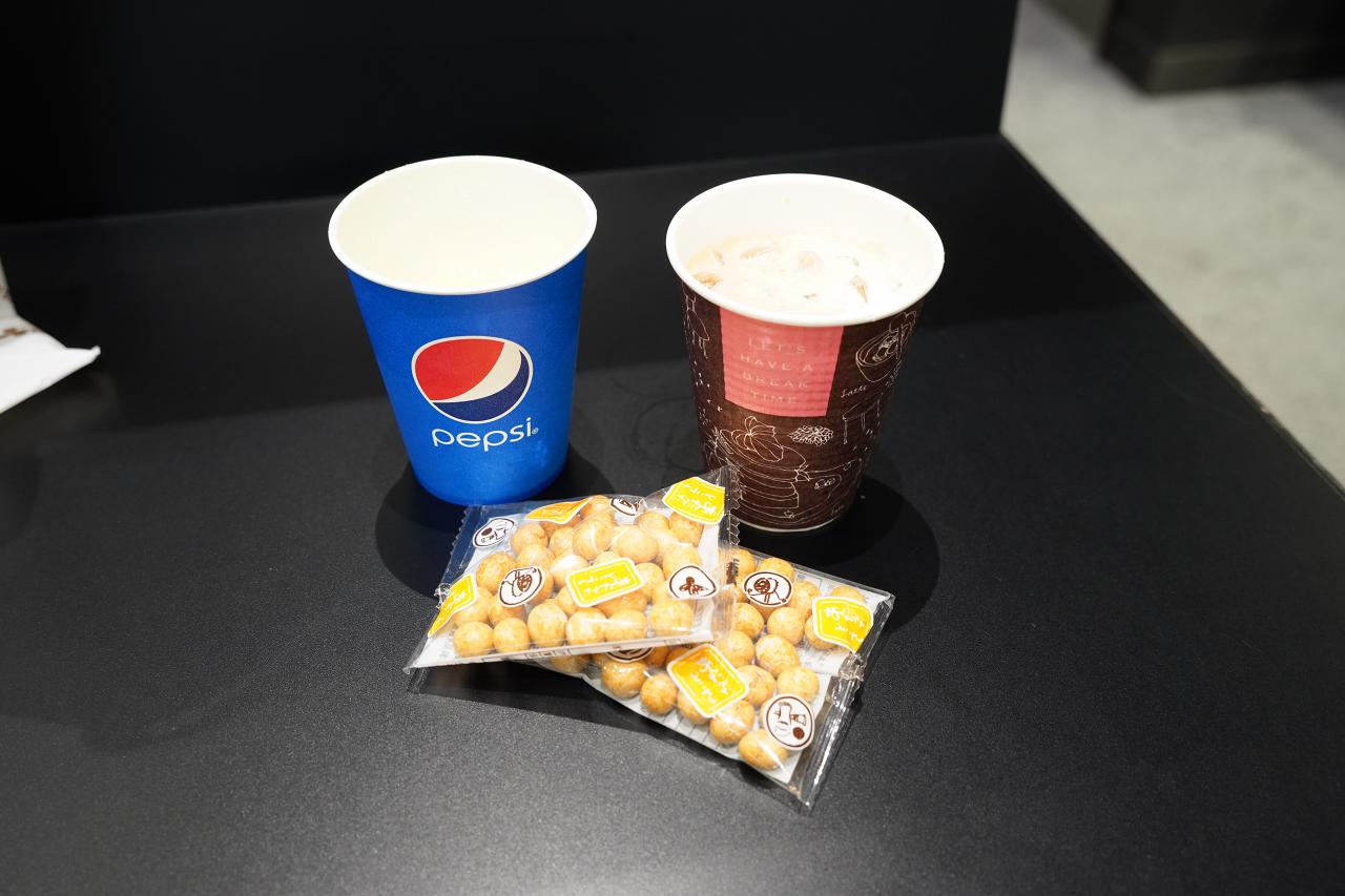 ソフトドリンクはドリンクバー形式で提供。カフェオレやカプチーノも出せるコーヒーサーバーの他、炭酸などのジュースが飲めます。さらにおつまみもあって嬉しい。