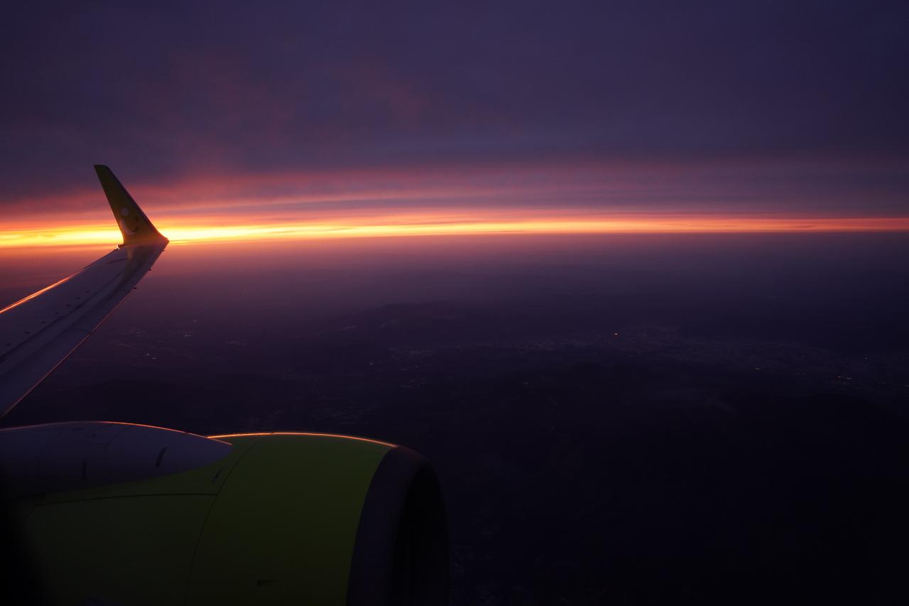 夕日が雲に当たって、幻想的な光景を眺めながらのフライト。でも良く考えたら19時なんですよね。日が伸びたなぁって実感できます。
