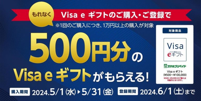 実施されるキャンペーンは、2024年5月1日から31日までの期間中に1万円以上の「Visa eギフト」を購入の上で専用サイトからエントリーすると、500円分のVisa eギフト(残高)がもらえるという内容。1万円以上で500円なので、最大で5%還元が受けられる計算です。