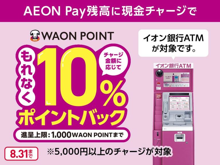 イオングループを中心に利用できるコード決済アプリ「AEON Pay」で、イオン銀行ATMから残高をチャージすると10%分の「WAON POINT」を還元するキャンペーンが、2024年8月1日から31日までの期間限定で実施しています。