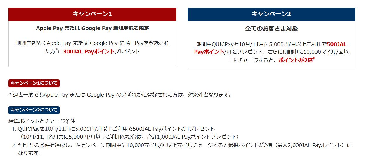 実施期間は2024年10月1日から11月30日までとなっているものの、「1か月に5,000円以上QUICPayを使うと500JAL Payポイントを進呈」という内容が2か月連続で実施される仕組みです。月ごとの還元上限となることと、良くある「上限500ポイントで10%還元」ではなく「5,000円使うと500ポイント還元」なので、4,999円だと1ポイントももらえない点には注意が必要です。