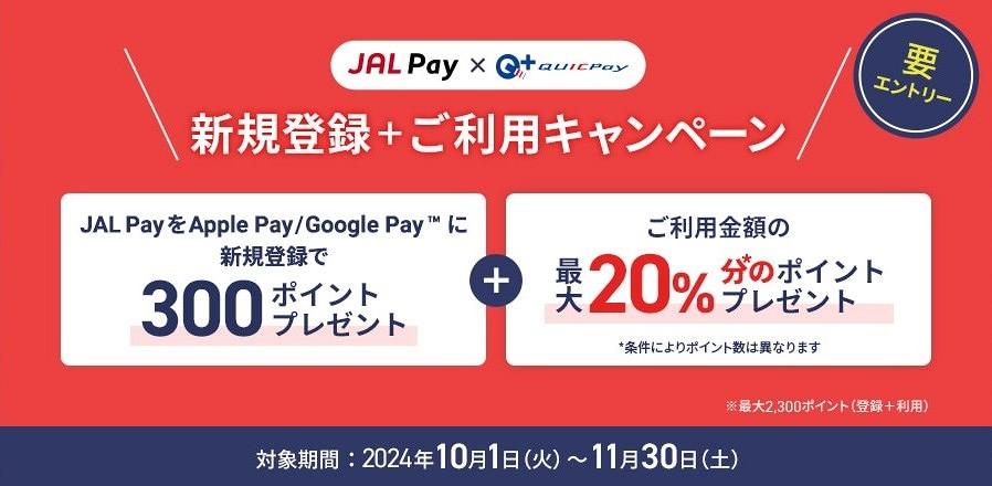 JAL Payが実施するキャンペーンは、「特設サイトからのエントリー」の上で、JAL PayをApple PayやGoogle Payに登録後に「QUICPay+」を使用すると最大20%が還元されるという内容。しかし最大の還元を受けるためにはJAL Payに1万マイルのチャージが必要となるため、事実上10%還元のキャンペーンと思っていたほうがよいでしょう。