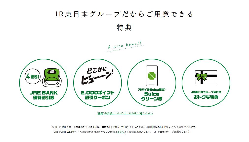 | 特典4 | JRE BANKに紐付いたJRE POINTのIDに対してモバイルSuicaを登録 | 500ポイント |