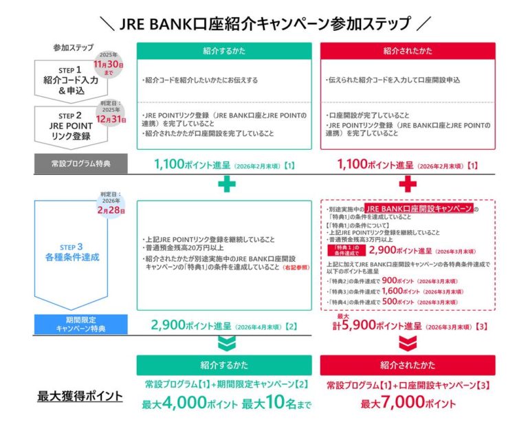 紹介する側の条件は比較的容易となっており、「JRE POINT」のリンク登録と口座残高のみ。リンク登録はすでにJRE BANKの特典を受け取っているのであれば実施済みかと思います。口座残高の条件に関しては、2026年2月28日に「20万円以上」の残高を有していることが必要。ずっとではなく1日だけなので、あまりハードルは高くないと思います。