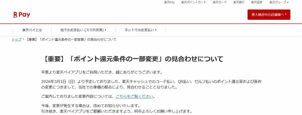 私もこれでは使う価値もないな、と2026年2月までで楽天ペイは無用の長物になる予定だったのですが、わずか1週間ほどで改悪の撤廃を発表。